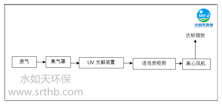 各工序的废气经集气罩收集后在离心风机引入UV光解装置进行净化,有机气体在紫外线作用下使其链结构断裂,使有机气体物质转化为无害味的小分子化合物或者完全矿化,生成水和CO2,然后在进入活性炭吸附装置进行二级吸附处理,活性炭利用多孔性吸附剂处理气体混合物,脱除气态污染物中的水份、有机溶剂蒸汽、恶臭和其他有害气相物质。废气经过二级处理后的废气高空达标排放。