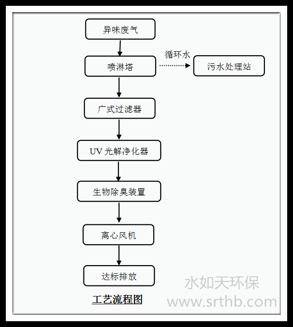 根据业主提供的环评资料,工艺采用了“喷淋塔+广式过滤器+UV光解净化器+生物除臭装置”。工艺流程图如下所示: