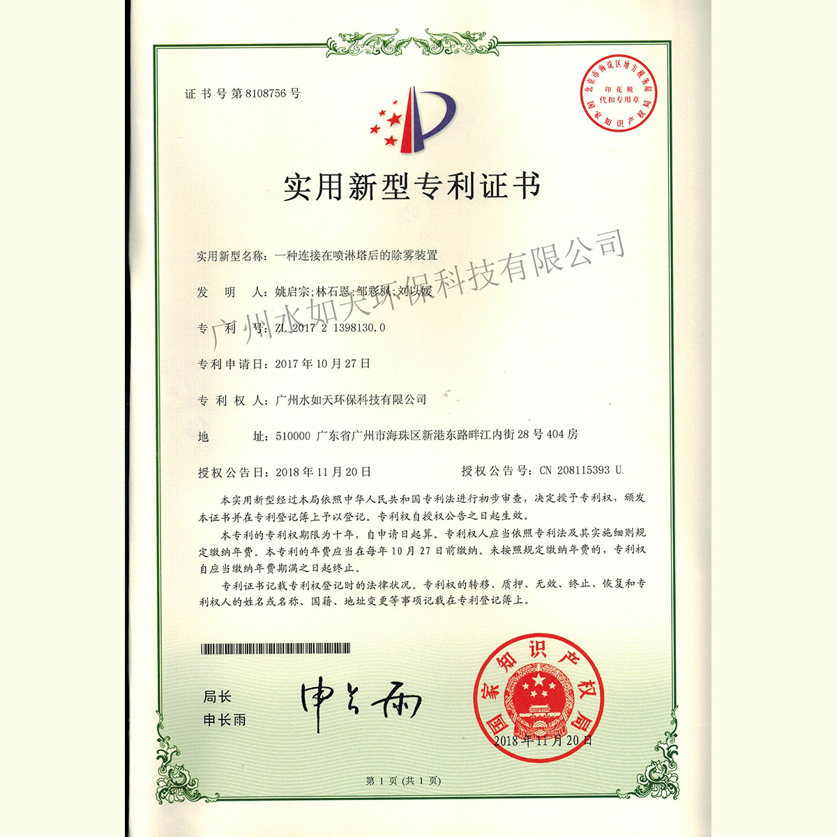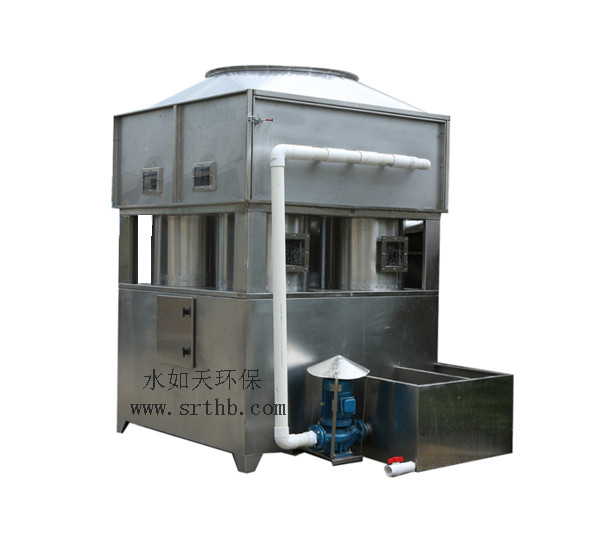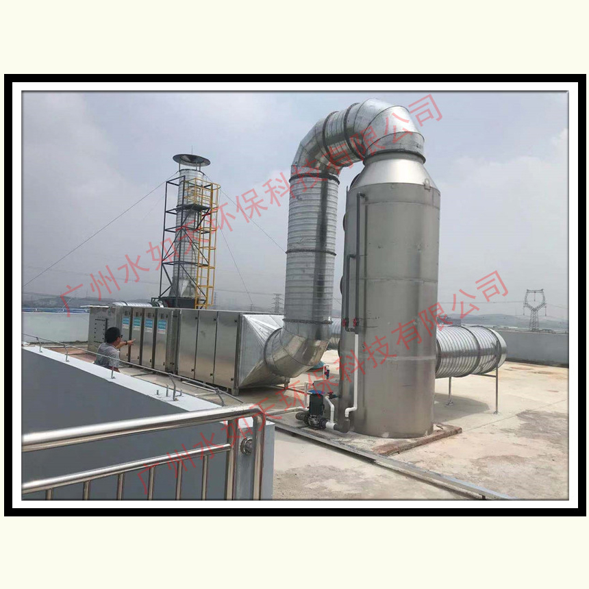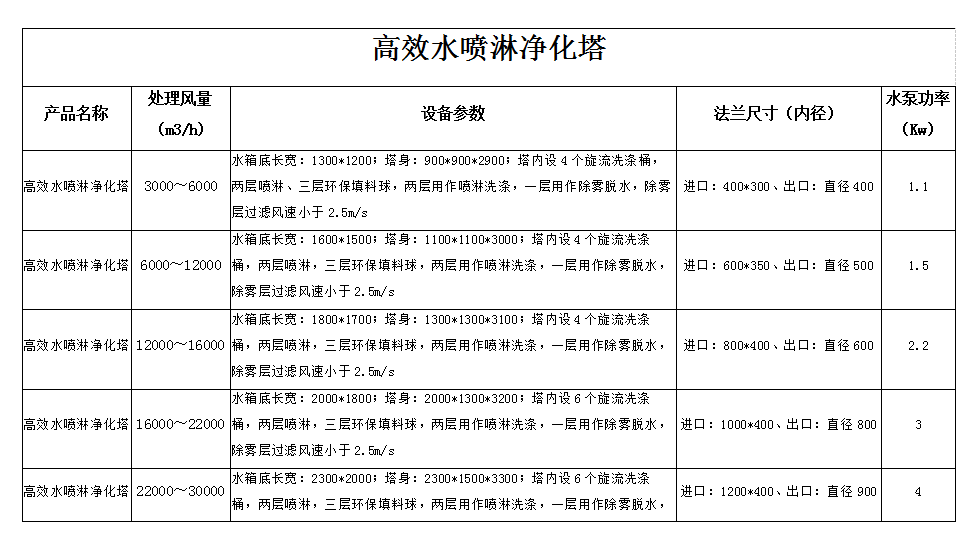 我司的水喷淋塔主要的运作方式是不断酸雾废气由风管引入净化塔,经过填料层,废气与氢氧化钠吸收液进行气液两相充分接触吸收中和反应,酸雾废气经过净化后,再经除雾板脱水除雾后由风机排入大气。吸收液在塔底经水泵增压后在塔顶喷淋而下,最后回流至塔底循环使用。净化后的酸雾废气达到广东省地方排放标准的排放要求,低于国家排放标准。