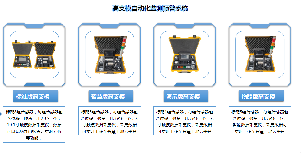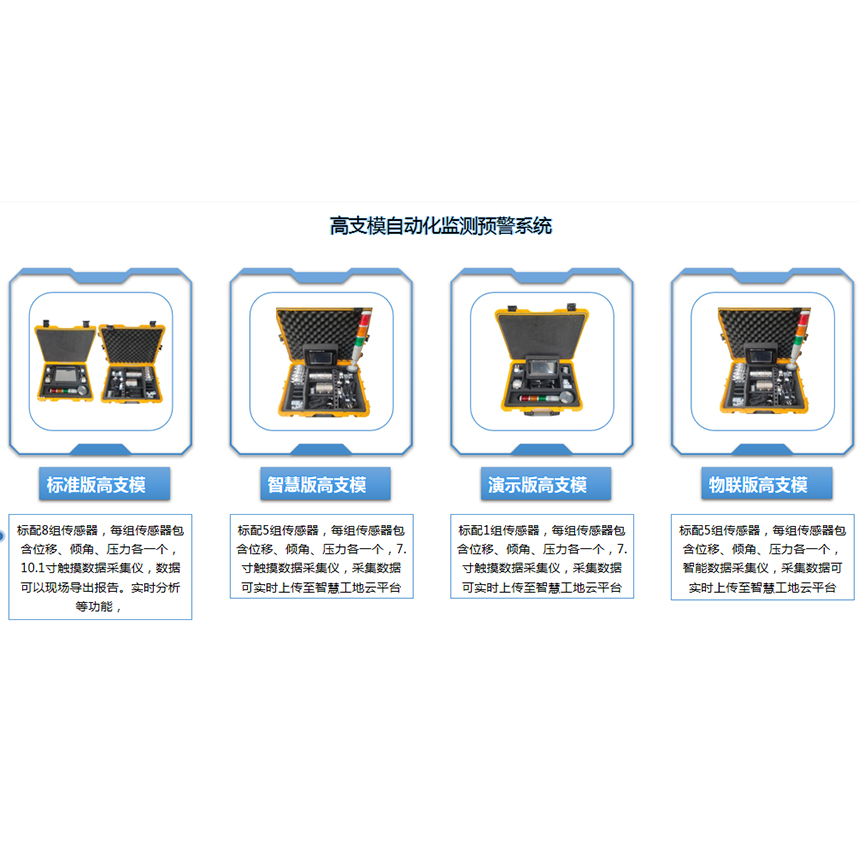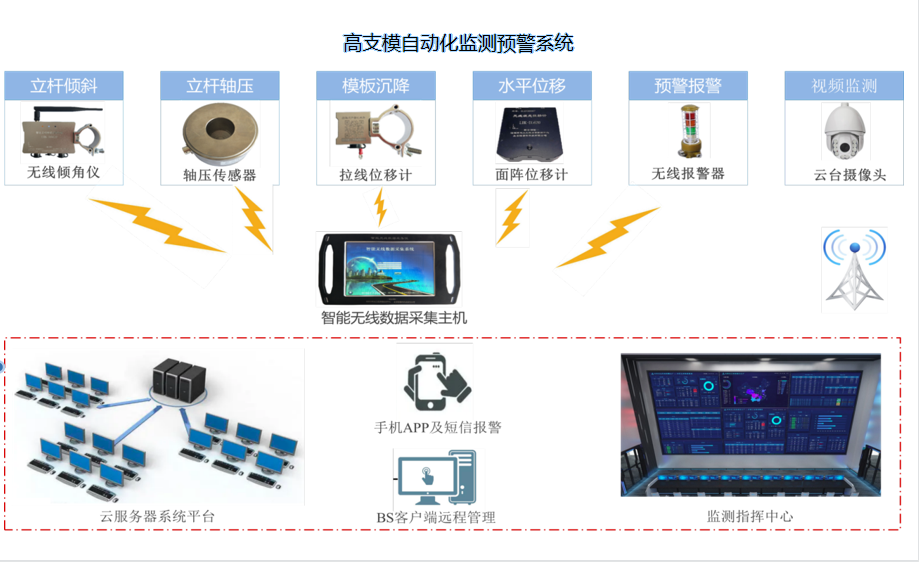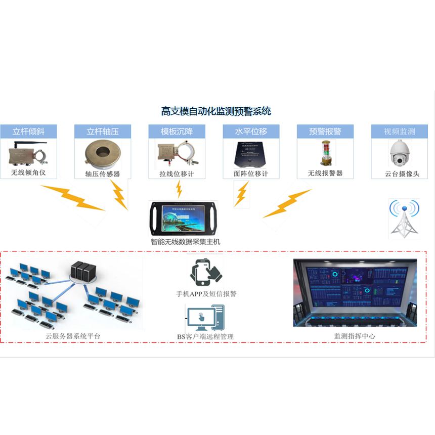 高支模是指支模高度大于或等于5m 时的支模作业。高支模自动化监测预警系统适用于实时在线监控高支模结构安全,包含高支模模板沉降、立杆倾斜、立杆轴压、水平位移等。