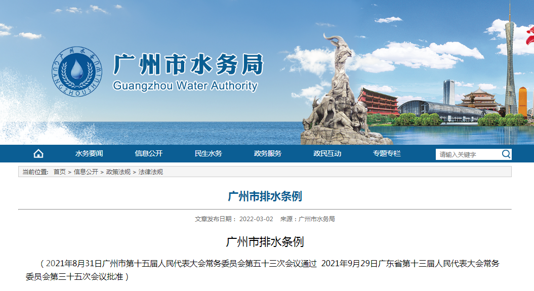 本报讯 近日,记者从广州市水务局获悉,《广州市排水条例》(以下简称《条例》)已于2022年3月1日起正式施行。接下来,在广州无论单位还是个人违法排水将受到法律约束。据悉,《条例》以排水与污水处理全覆盖、全收集、全处理为目标,以提质增效为重点,通过制度创新强优势补短板,为广州实现老城市新活力“四个出新出彩”提供有力支撑和保障。