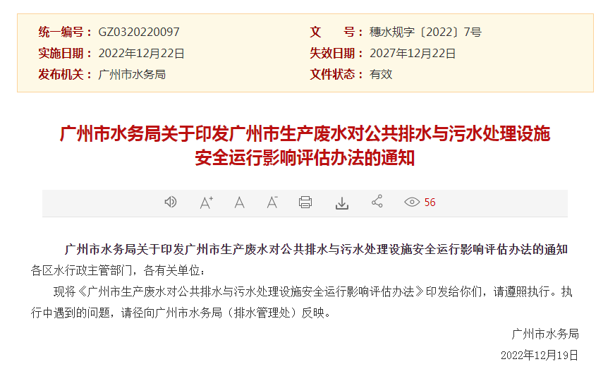 12月22日,广州市水务局在广州市人民政府官网,发出《广州市生产废水对公共排水与污水处理设施安全运行影响评估办法》(以下简称《评估办法》)。根据《评估办法》,生产废水经评估不对公共排水与污水处理设施正常运行产生影响时,可有条件通过公共排水与污水处理设施处理。