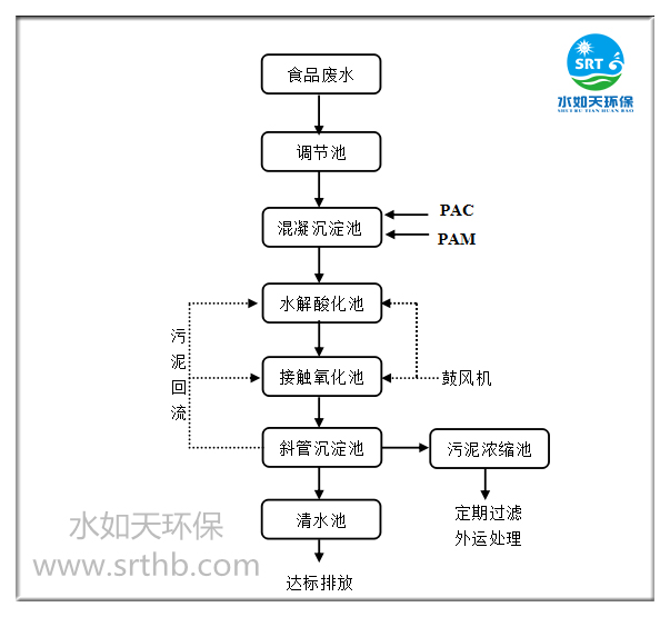 该食品废水含有大量的糖分和悬浮物等各种污染物,具有较高的COD和SS等特点。因本项目排放要求为第二时段一级标准,所以本方案选择“混凝沉淀+水解酸化+接触氧化”处理工艺。