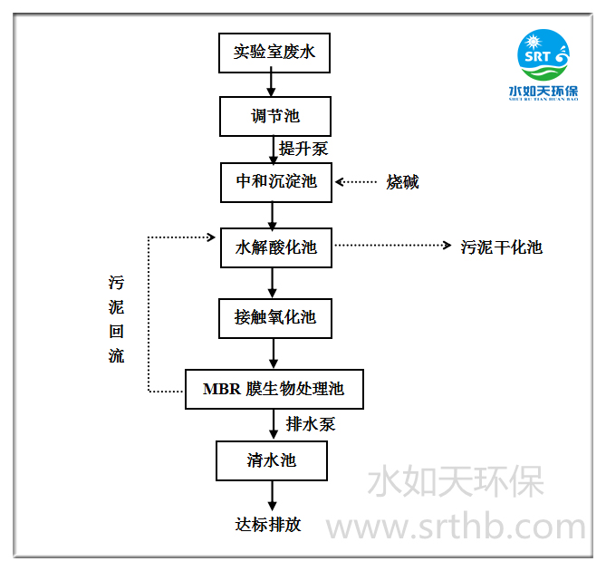 根据同类废水的经验,实验室清洗废水水质比较复杂,但普遍浓度较低,且总体水质的可生化性较强,因此,本方案拟选用“酸碱中和+水解酸化调节+接触氧化+MBR膜生物处理”作为该项目污水处理的主要工艺,工艺设施做成一体化装置,外观美观大方,设备紧凑,操作方便。