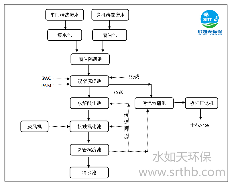 配件清洗废水和钩机清洗废水一起进入隔油隔渣池统一收集,进行水质水量的均化,由污水提升泵抽入管道混合器进行混凝和絮凝反应再进入混凝沉淀池进行泥水分离沉淀反应处理,沉淀池出水进入水解酸化池,在厌氧菌的作用下,大分子有机物被分解为小分子有机物,为后续好氧处理提供了可生化性,接着进入生物接触氧化池进行二级处理,在接触氧化池内污水通过与活性污泥接触,在曝气条件下有机物被微生物分解降解,接触氧化池出水通过斜管沉淀池进行泥水分离,上清液进入清水池外排。沉淀池的污泥回流至前端生化池,剩余污泥由污泥泵抽至污泥浓缩池进行浓缩,气浮产生的浮渣刮入污泥浓缩池后,定期由隔膜泵抽至板框压滤机压滤,泥饼由有资质的专业公司外运处理。