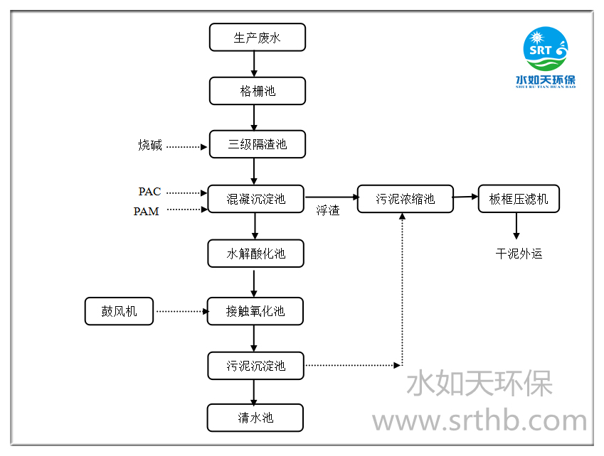 车间生产废水首先统一排入格栅井隔滤去除大块负责杂物,再进入调节池进行水质水量的均化,由污水提升泵抽入管道混合器进行混凝和絮凝反应再进入混凝沉淀池进行泥水分离沉淀反应处理,沉淀池出水进入水解酸化池,在厌氧菌的作用下,大分子有机物被分解为小分子有机物,为后续好氧处理提供了可生化性,接着进入生物接触氧化池进行二级处理,在接触氧化池内污水通过与活性污泥接触,在曝气条件下有机物被微生物分解降解,接触氧化池出水通过斜管沉淀池进行泥水分离,上清液进入清水池外排。沉淀池的污泥回流至前端生化池,剩余污泥由污泥泵抽至污泥浓缩池进行浓缩,气浮产生的浮渣刮入污泥浓缩池后,定期由隔膜泵抽至板框压滤机压滤,泥饼由有资质的专业公司外运处理。