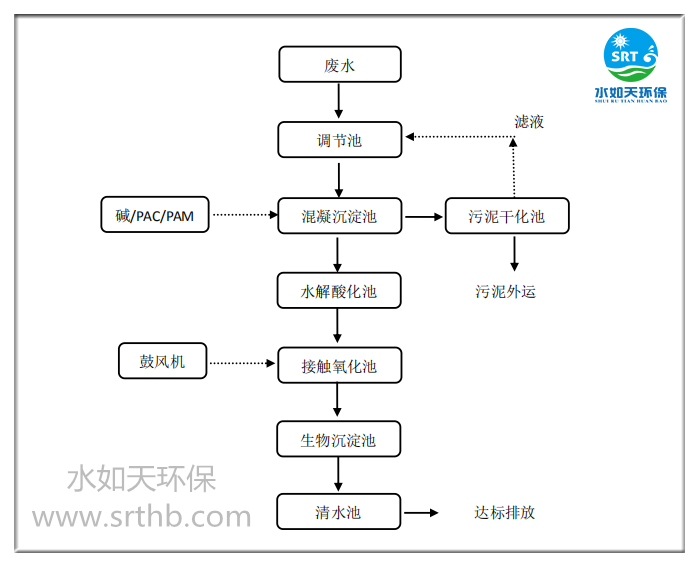 清洗废水/生活污水通过自流进入调节池,增加水泵及液位浮球控制,当水位达到一定液位时,自动启动水泵把水抽至后端混凝沉淀池中,在抽至过程中,投加碱、PAC 及 PAM,通过管道混合器与废水充分混合,进行混凝反应后在沉淀池中泥水分离。上清液经过出水槽流出,而沉淀过后的污泥经过不定时排放到污泥干化池中进行泥水分离,形成的干泥定时外运。上清液经过出水槽进入水解池后,通过微生物降价,把大分子污染物分解成小分子污染物,然后进入接触氧化池,在接触氧化池内溶解氧提高,为微生物降价污染物提供良好环境,经过生物沉淀池进行泥水分离,上清液流入清水池,清水池里水位达到一定液位自流而出。上清液进入清水池外排。