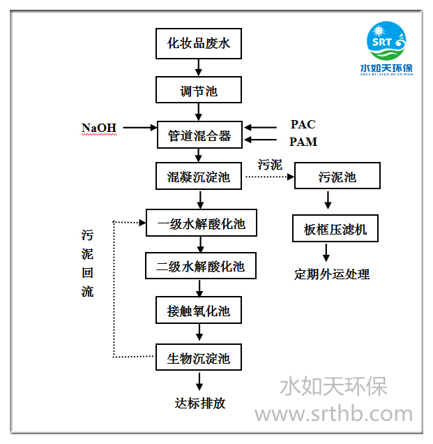 废水首先统一排入调节池进行隔油隔渣及水质水量的均化作用,然后经过污水提升泵抽上混凝沉淀池,废水进入沉淀池过程中,先加入NaOH溶液,将pH值调到8左右,然后再加入PAC溶液,最后加入PAM药剂,经过管道混合器的混合均匀后,进入混凝沉淀池与废水一起反应。当废水在流经沉淀沉速加大,实现固液分离。混凝沉淀池出水流入水解酸化池,在大量水解细菌、酸化菌作用下将不溶性有机物水解为溶解性有机物,将难生物降解的大分子物质转化为易生物降解的小分子物质,从而改善废水的可生化性。水解酸化池出水进入接触氧化池再流入斜管沉淀池,它既可以高效地进行固液分离,得到直接使用的稳定中水,又可在生物池内维持高浓度的微生物量,工艺剩余污泥少,极有效地去除氨氮,出水悬浮物和浊度接近于零。(如需了解更多详情欢迎致电:姚工:13926003430)