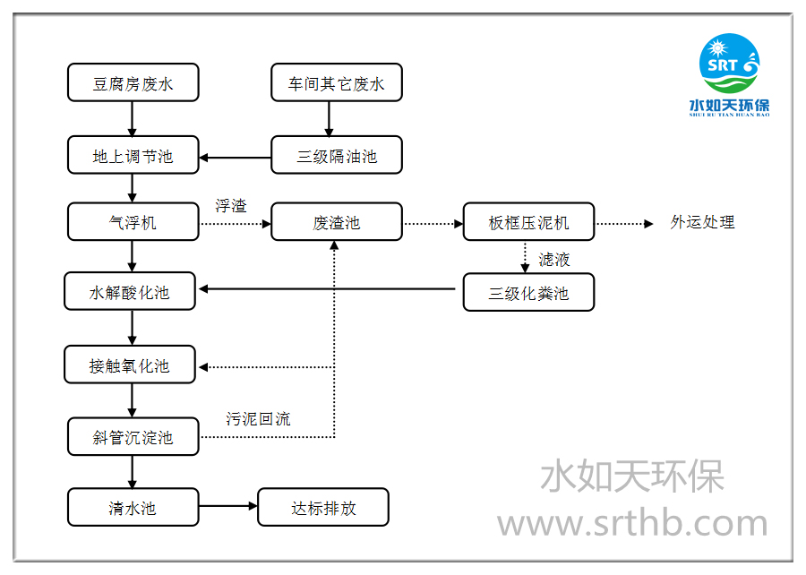 豆腐房废水直接进入地面调节池,其它厨房废水直接排入地下三级隔油隔渣池,去除大块杂物和油渣后由提升泵抽入地面调节池进行均和水质后,由污水提升泵抽入气浮反应池进行混凝气浮反应处理,气浮处理过程中通过高分子混凝剂和污水中的有机物进行反应结合,在溶气水的作用下实现渣水分离,清水从气浮池底部进入清水池后排放进入生化处理系统,经过水解酸化和接触氧化的微生物处理工艺,将污水的有机物进一步降解,大量的污染物质被微生物菌种消化掉,从而得到更清的出水,达到一级排放标准后排入市政管道。浮渣刮入废渣池浓缩后由隔膜泵抽入板框压滤机进行脱水,干污泥外运处理。(如需了解更多详情欢迎致电: 姚工:13926003430)