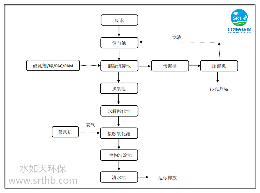 本项目主营产品为:洗衣液,皂液,沐浴露,洗发水等洗护产品,针对该生产废水的水质特点,设计处理工艺流程如下所示: