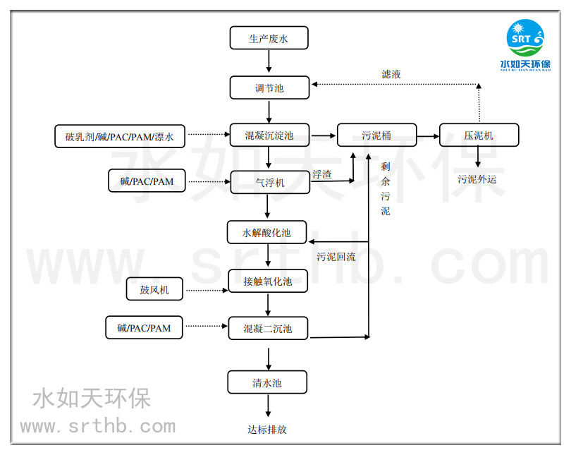 清洗废水通过自流进入调节池。增加水泵及液位浮球控制,当水位达到一定液位时,自动启动水泵把水抽至后端混凝沉淀池中,在抽至过程中,投加破乳剂、碱、PAC 及 PAM,通过管道混合器与废水充分混合,进行混凝反应后在沉淀池中泥水分离。上清液经过出水槽流出,而沉淀过后的污泥经过不定时排放到污泥池中进行污泥浓缩,浓缩后的污泥用隔膜泵抽至压泥机进行压缩脱水,压出的滤液水泵抽至调节池,产生泥饼定期清理。沉淀池上清液经过出水槽进入气浮机进行二次深度物化处理后进入水解池,通过微生物降价,把大分子污染物分解成小分子污染物,然后进入接触氧化池,在接触氧化池内溶解氧提高,为微生物降价污染物提供良好环境,经过混凝二沉池进行泥水分离,上清液流入清水池,清水池里水位达到一定液位自流而出。