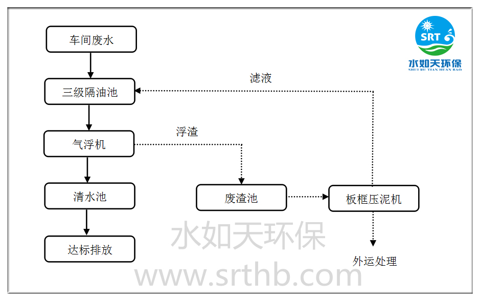 本项目废水的主要污染物质是COD、BOD5、悬浮物(SS)和石油类等,针对该废水的特性,及排放标准的要求,采用 “隔油处理+混凝气浮”的处理工艺进行设计处理。 该工艺处理技术成熟,主体结构简单,可控性强。